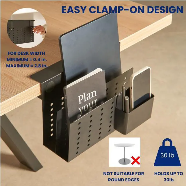 EFFORTLESS NO-DRILL ATTACHMENT Transform your workspace in minutes with the Desk Side Storage Organizer. The screwable clamp makes installation a breeze, requiring no drilling or complex tools. Attach it securely to any desk edge and enjoy instant organization. Say goodbye to clutter and hello to a streamlined setup thats as easy to install as it is to love. ^^ SPACIOUS MULTI-FUNCTIONALITY DESIGN Keep your essentials neatly organized with this thoughtfully designed storage solution. The spacious compartments provide room for laptops, tablets, notebooks, and more. Pens, pencils, and other stationery fit perfectly in their designated spaces.