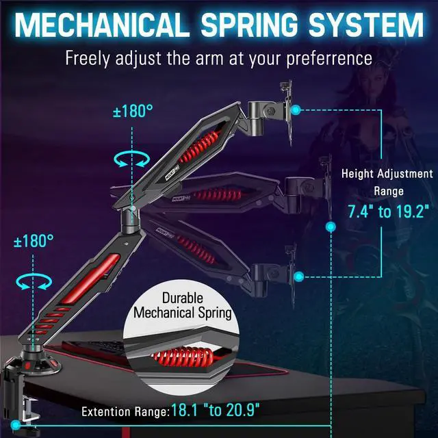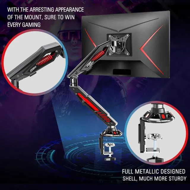 SMART APPEARANCE: This single monitor mount is specially designed for electronic sports, with its sleek technological design of the wild-style shell and an eye-catching red mechanical spring. Just explore a new visual world during the online RUSH HOUR with this innovative gaming monitor mount, and WIN IT! ^^