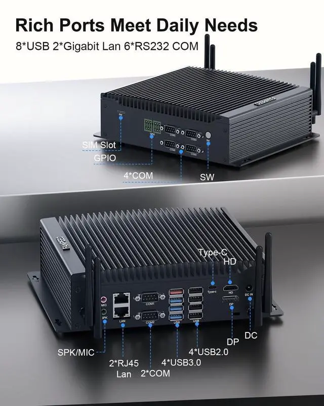 Dual-channel DDR4 memory: Two 260-pin SODIMM slots support up to 64GB. Easy to install and maintain, it allows for smooth multitasking. ^^ Rich Industrial-Grade InterfacesThis industrial-grade mini PC integrates 6 COM ports (configurable as RS232/485/422), 2 Gigabit Ethernet ports, 8 USB ports, and 2 GPIO interfaces, allowing direct connection to PLCs, sensors, and industrial control devices without the need for additional converters. Additionally, it features 2 CAN ports and a SIM card slot (not installed by default), allowing for easy expansion with a 4G/5G module, making IoT deployment even more convenient. ^^ Triple-screen 4K output, compact and space-saving The FANPEEC fanless industrial computer supports triple display via HD, EDP, and Type-C, delivering ultra-clear 4K image quality, making it ideal for surveillance panels and digital signage. Its lightweight 1.9 kg chassis supports VESA wall mounting for concealed installation, saving 80% of desk space compared to traditional desktops. ^^ Fanless Design, Stable and DurableThis fanless industrial computer adopts an all-aluminum body, operates quietly, and the wide temperature design (-10 to 50) can effectively prevent dust. Ultra-low power consumption of 75W ensures stable operation around the clock.