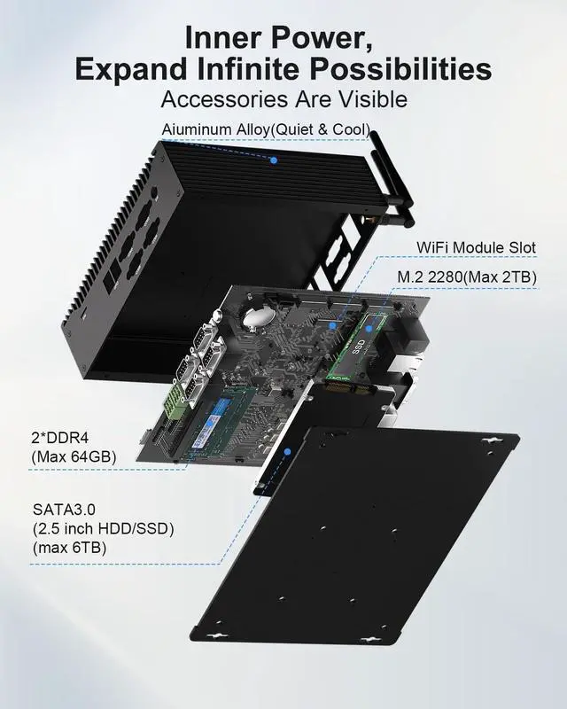 Powerful performance for complex tasksThe fanless mini pc is equipped with an advanced Core i7-10610U processor (4 cores, 8 threads, turbo frequency up to 4.9GH z, 8MB smart cache), designed for industrial-grade multitasking, and can efficiently run professional software, data analysis, and IoT applications. ^^ Dual Storage + Large Memory, Flexible and Worry-Free Expansion This industrial computer features a high-speed M. 2 2280 SSD with dual NVMe/SATA protocol support (up to 2TB) and can be expanded with a 2.5 -inch HDD/SSD (up to 6TB), ensuring seamless storage of massive data.