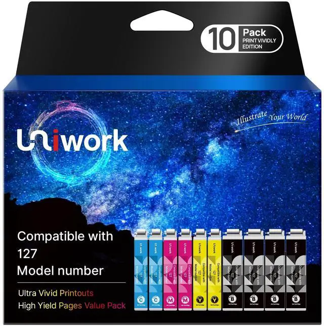 ^^ Package Contents: 4 Large Black for epson 127 Ink Cartridges, 2 Cyan for epson 127 Ink Cartridges, 2 Magenta for epson 127 Ink Cartridges, 2 Yellow for epson 127 Ink Cartridges ^^ Uniwork 127 Ink Cartridges Produces with brilliant color and sharp black prints.