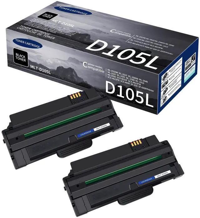 Package Contents: 2 x User Guide, 2 x MLT-D105L MLT D105L High Yield Black Toner Cartridge ^^ Expected yield of 2, 500 pages per toner, 2PK toner 5000 Pages. Approx. cartridge yield in accordance with ISO/IEC 19752 (Based on 5% coverage) (Color: Black) ^^