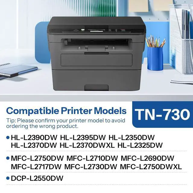 Compatible Printer Models: MFCL2750DW HLL2390DW MFCL2710DW HL-L2350DW HLL2395DW HL-L2370DW HL-L2370DWXL HL-L2325DW DCPL2550DW MFC-L2690DW MFCL2717DW MFC-L2730DW MFC -L2750DWXL ^^ The page yield of each tn730 black toner is up to 1200 pages (Based on up to 15% coverage) ^^