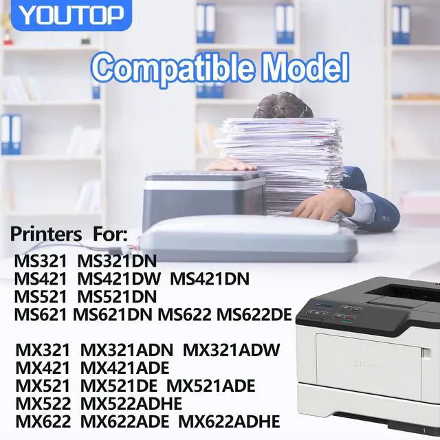Compatible Printers: MS321, MS321dn, MS421, MS421dn, MS421dw, MS521, MS521dn, MS621, MS621dn, MS622, MS622de, MX321, MX321adn, MX321adw, MX421, MX421ade, MX521, MX521de, MX521ade, MX522, MX522adhe, MX622, MX622ade MX622adhe Printer ^^ Print Clear and sharp contentsNatural and vibrant images ^^