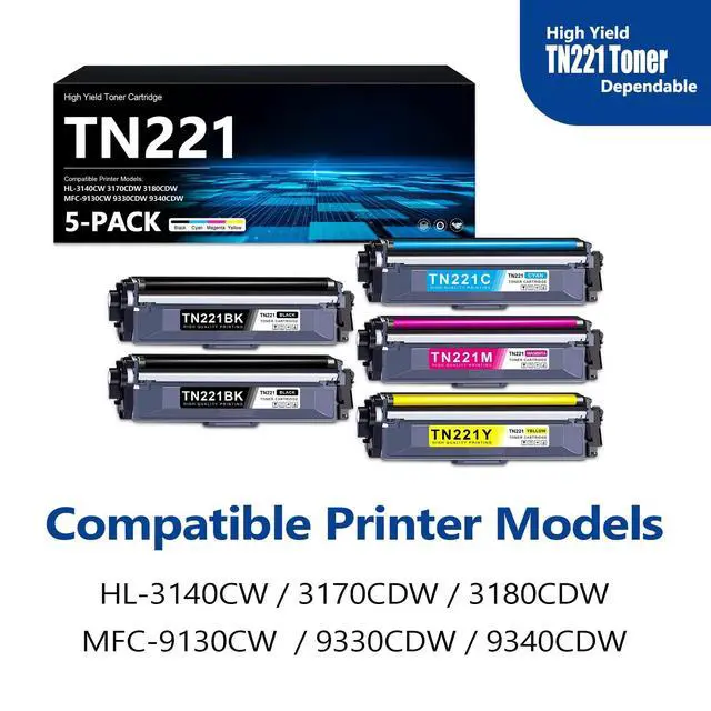 What's in the box: new TN221 TN-221 Toner Cartridge 5-Pack (2 Black, 1 Cyan, 1 Magenta, 1 Yellow)