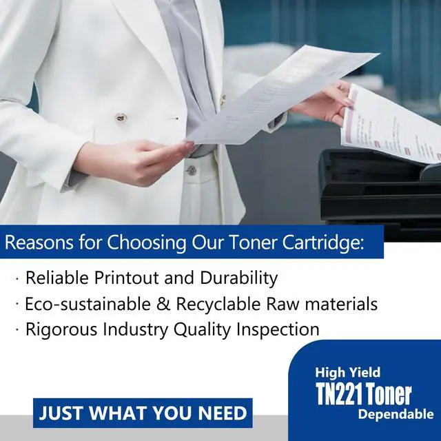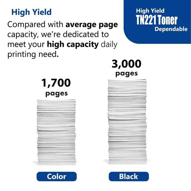 Yield: 3, 000 pages per Black toner cartridge, 1, 700 pages per Color toner cartridge at 5% coverage (Letter/A4) ^^ Use our TN-221 Toner Cartridges to avoid toner leaks or premature failures as much as possible ^^ Buy sustainable Recycled content is included in our toner cartridges ^^ Help protect your printer from dangerous code and integrate your our data with tamper-resistant chips, firmware and packaging ^^ Our TN 221 Toner is devoted to office air quality, which means that our toner is voluntarily designed and tests its printing systems to meet eco-label emissions guidelines ^^
