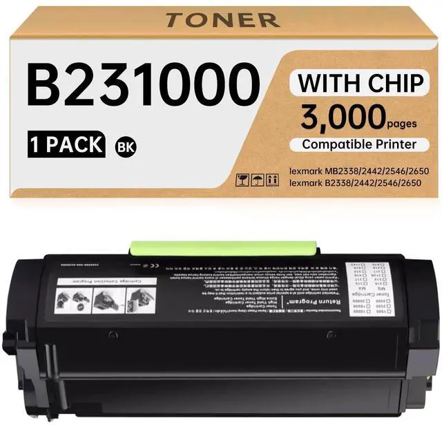 Included in the package - You will receive 1 pc of B231000 toner cartridge with 3000 pages and 5% toner coverage ^^ Compatible with a wide range of printers - The B231000 toner cartridge is compatible with Lexmark B2338 B2442 B2546 B2650 MB2338 MB2442 MB2546 MB2650 laser printers ^^ Clear Printing - B231000 adopts fine toner, which is not easy to leak, and the printed images and text are clear and natural, not rough, and not easy to lose color ^^ Quality Assurance - The B231000 toner cartridge supports continuous printing and can go through 100 prints without degradation, so the printing process is natural and smooth ^^ New Smart Chip - B231000 toner cartridge contains a new upgraded smart chip, customers are free to install and replace the use of debugging, convenient and fast