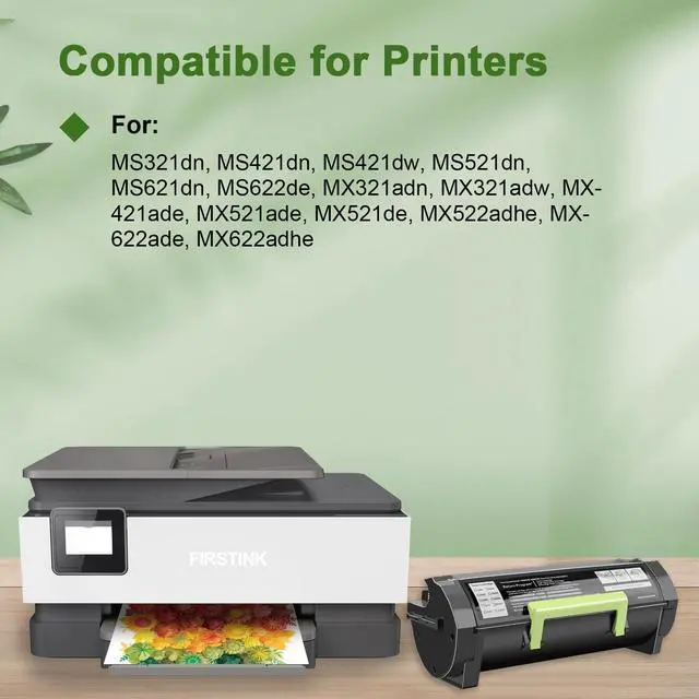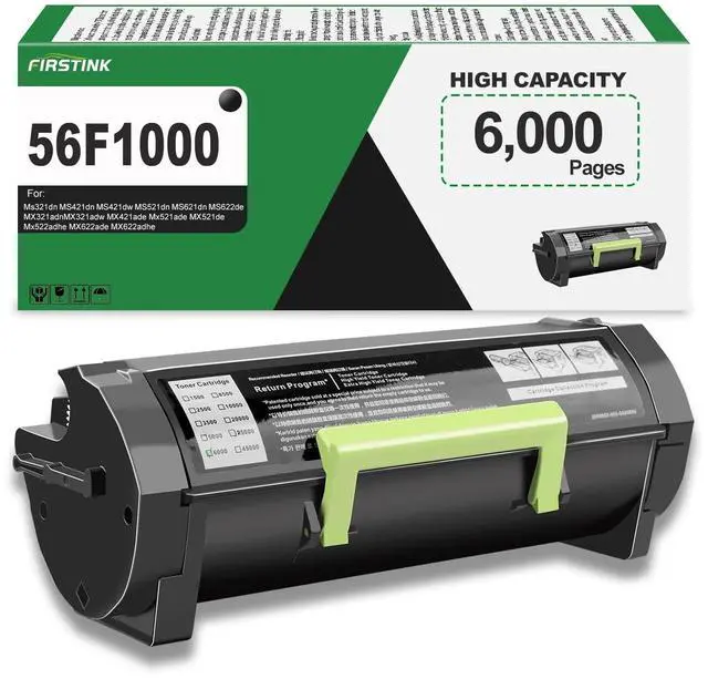 Packaging Includes1 Pack 56F1000 Black Toner Cartridge ^^ Compatible PrintersMS321dn MS421dn MS421dw MS521dn MS621dn MS622de MX321adn MX321adw MX421ade MX521ade MX521de MX522adhe MX622ade MX622adhe Printer ^^ High Print Volumeup 6, 000 Pages Per each 56F1000 Black Toner Cartridge(at 5% coverage) ^^
