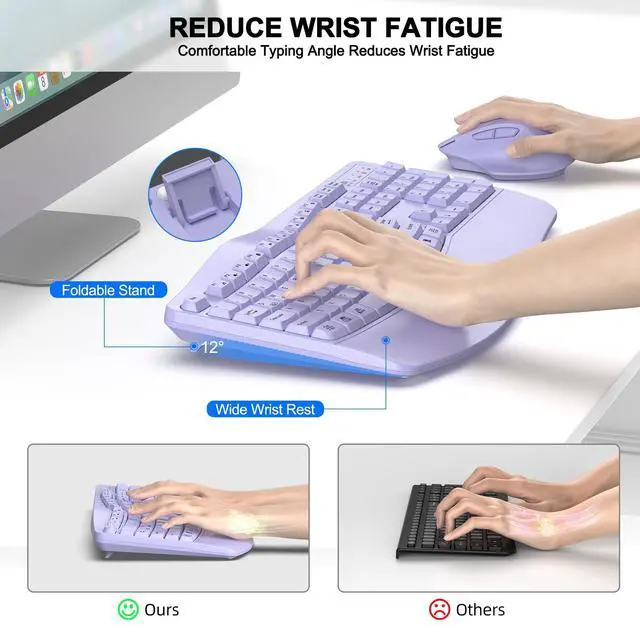 Wave Ergonomic Wireless Keyboard and Mouse ComboThe wireless keyboard features a wave key and wrist rest design that naturally fits your fingers and relieves wrist strain. The adjustable stand allows you to set the keyboard to the most comfortable height, making it ideal for long-term use.
