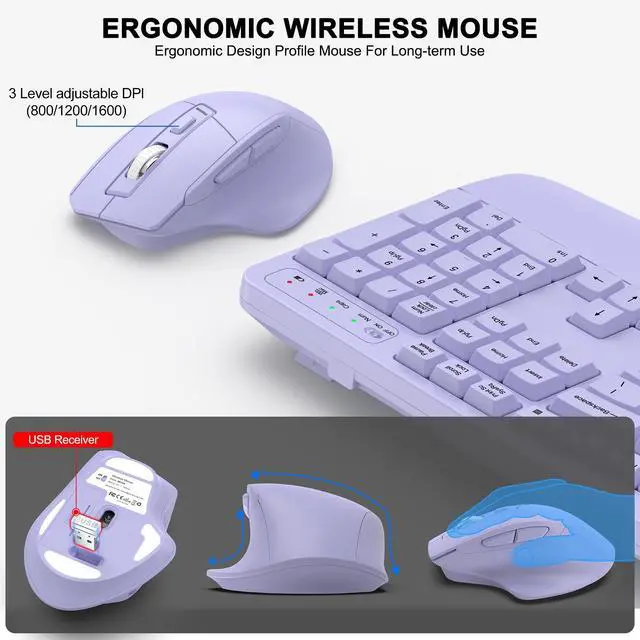 Note: The USB receiver is located on the back of the mouse. ^^ Wireless Optical MouseThe wireless mouse is designed with comfort in mind, featuring a contoured shape that fits snugly in the palm and complements the natural curve of your right hand. All controls are easily within reach. This mouse is equipped with forward and back functions, allowing you to navigate the web faster and more efficiently than ever before. ^^ Plug-and-Play 2.4G Wireless ConnectionOne 2.4 GHz USB receiver can connect both the keyboard and mouse, or they can be used separately. Plug and playno software download is required. The 2.4 GHz wireless connection offers a strong and reliable signal up to 33 feet (10 meters), without delays. ^^ Automatic Power Saving FunctionThe ULSOU wireless keyboard and mouse combo features an automatic power-saving function. After 30 seconds of inactivity on the keyboard and 15 minutes of inactivity on the mouse, both devices enter sleep mode to conserve battery life. This greatly extends battery life, and any button press will activate the devices again. The keyboard requires 1 AA battery, and the mouse requires 1 AA battery.