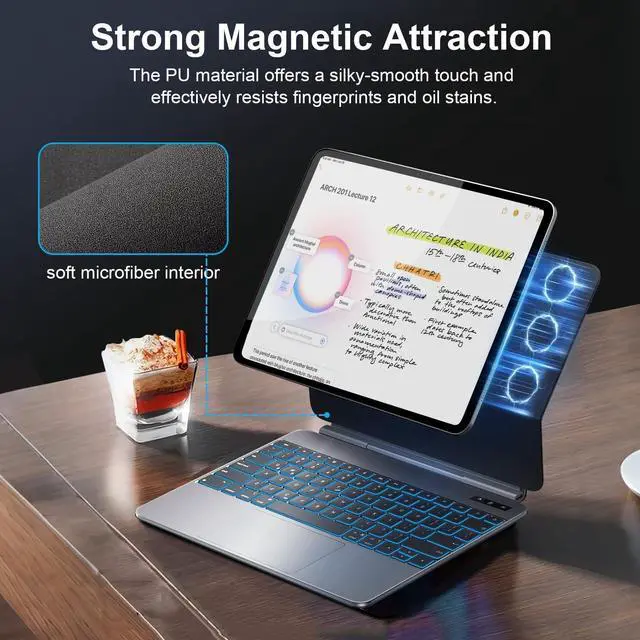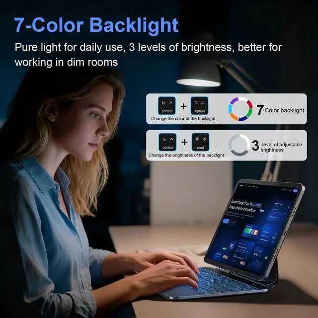 Backlit & Scissor-Switch Keys: A premium iPad Pro keyboard features 7 adjustable backlight colors and 3 customizable brightness levelsideal for typing in dimly lit spaces like night shifts, low-light offices, or travel cabins. Paired with ergonomically designed scissor-switch keys that deliver quiet, responsive tactile feedback, each keystroke offers crisp, comfortable precision, effectively reducing hand and wrist fatigue during extended work, study, or creative sessions ^^