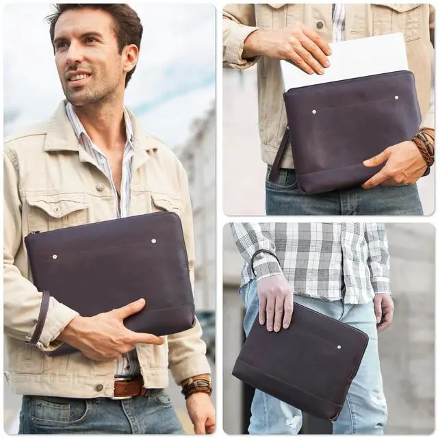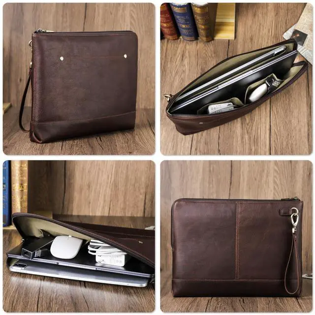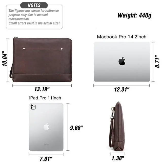 Elegant Top Grain Leather Our Laptop Sleeve Bags are crafted from premium top grain leather, known as Chamois Leather, this craft boasts a smooth texture and a refined appearance. Resistant to scratches, it ages beautifully, enhancing its elegance over time! ^^ Vintage Design, Modern Utility This handmade craft combines a minimalist vintage design with practicality. Sized at 13.19" x 10.04" x 1.38", it's perfect for compatible with 14.2" / 13.3" MacBook Pro and other accessories. Offering protection without sacrificing portability! ^^ Genuine Quality, Lasting Durability Our top grain leather showcases natural characteristics, setting it apart from artificial materials like split grain or PU.