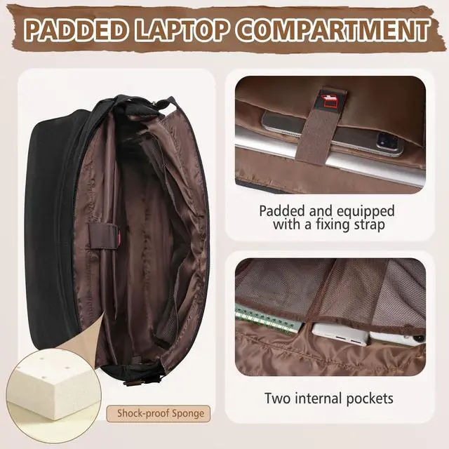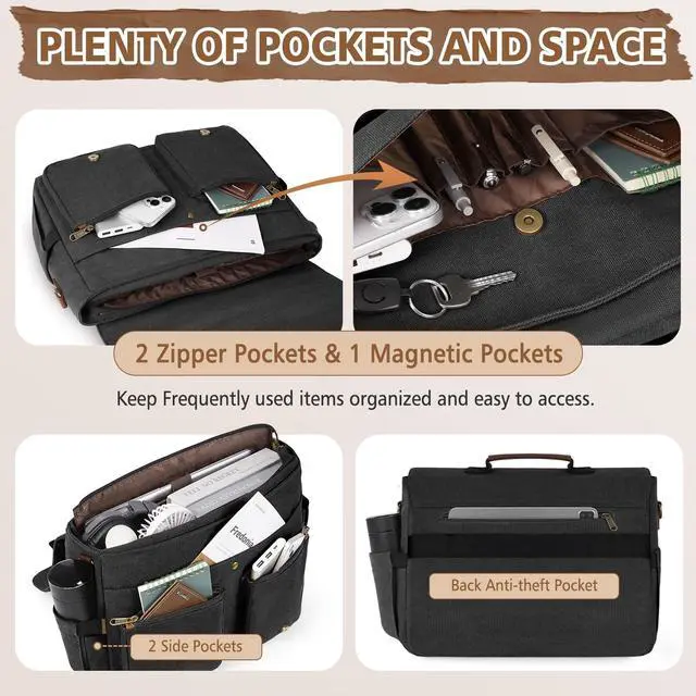 SAFE PADDED LAPTOP BAG: This canvas messenger bag features a padded pocket in the main compartment to protect your 15.6 -inch laptop, as well as ample space and two mesh pockets on the sides that can hold a variety of binkers, books and other items. Under the flip cover, this mens messenger bag also has two small zippered pockets and a large-capacity pocket with multiple slots, making everything well-organized and easy to find. And 2 convenient zipper outside pockets for frequently used items.