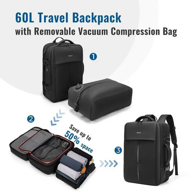 Built-In Pump CompressionThis vacuum backpack comes with an integrated built-in pump, paired with advanced airtight technology. Extract air to shrink items by 50 percent. It expands from a 126.718. 9 inch carry-on size to 60L capacity. No extra tools are needed, enabling fast and hassle-free vacuum storage. ^^ On-the-Go USB ChargingAs a vacuum seal travel backpack, it comes with a hidden USB charging port and cable compartment: power your phone, tablet or earbuds anytime during travel, no need to rummage through your luggage for chargers. ^^ Flight-ApprovedFlight-approved dimensionsand a TSA-friendly design enable quick airport security checks, easy placement in overhead bins or under seats, and an anti-theft back pocket for valuables safety, making it a perfect pick for air travel with versatile daily usability. ^^ Ergonomic ComfortOur vacuum backpack with pump features padded shoulder straps and a breathable honeycomb back panel, which distributes weight evenly to reduce shoulder and back strainperfect for all-day travel or commutes. ^^ Waterproof & VersatileThis compression backpack for travel is made of high-density waterproof fabric, and it doubles as a vacuum carry on backpackattach it to rolling luggage with the included strap for seamless business, leisure, or daily use.