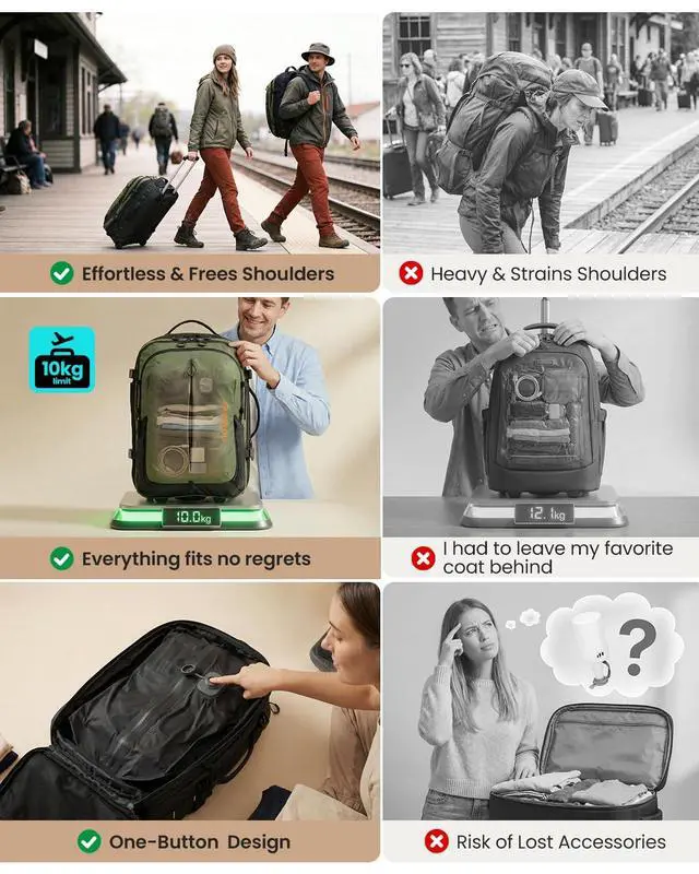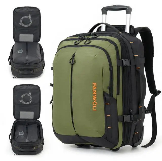 Rolling Backpack: The roller design effectively alleviates the heaviness of the backpack after fully loaded, equipped with anti slip and silent tank wheels, making every step at the airport station easier. For stairs or rough terrain, unfold the hidden thickened shoulder strap to convert it into a compression backpack for travel, the hidden wheel cover can be pulled out to keep clothes from getting dirty by wheel grime. Effortlessly switch to fully enjoy full scene travel ^^