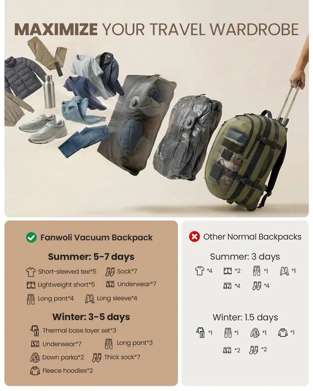 One-Button Vacuum Compression System: Say goodbye to manual pumps and easily lost accessories. Featuring a built-in electric pump, our vacuum backpack travel with pump compresses clothes by 30%-50% with a simple long-press, easily accommodating 5-7 days of clothing. Includes a USB cable for charging, ensuring that you can use this travel backpack with vacuum system to compress clothes at any time in campsites, dormitories, airports, never be left helpless with a bloated bag you can't re-compress ^^ Versatile 2-In-1