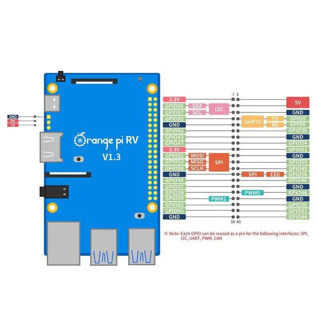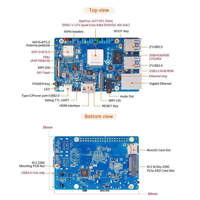 • Wi-Fi 5+BT 5 - Orange pi RISC V SBC supports PCIe2.0, Gigabit Ethernet, MIPI-CSI, MIPI-DSI, 40Pin expansion interface and other commonly used functional interfaces, and supports Linux operating system.