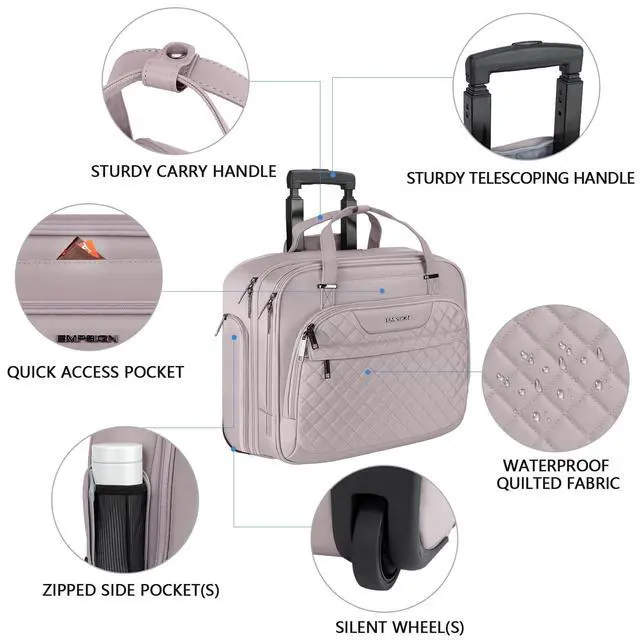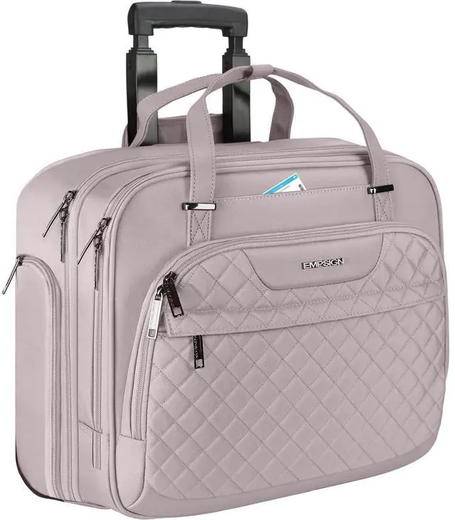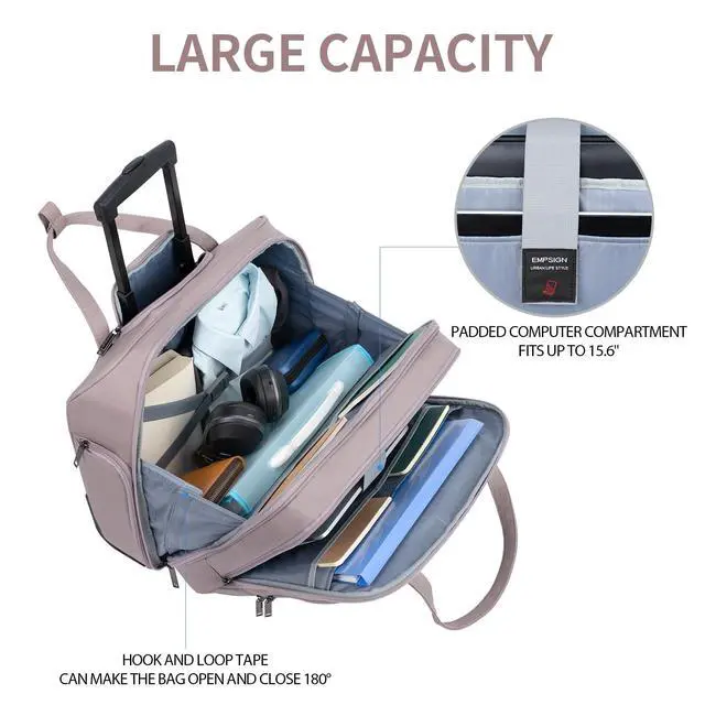 MOBILE OFFICE: EMPSIGN rolling bag with laptop compartment is multifunctional in one, suitable for both business and personal travel. Fits easily into most airline overhead bins and meets most airline carry-on size requirements. The case is made of polyester canvas fabric, waterproof and durable, which can deal with the unexpected and properly protect your belongings.