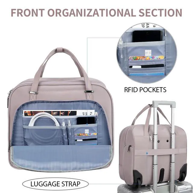^^ EASY TO CARRY: The rolling laptop case has a leather grip, smooth zippers and waterproof bottom corner guards; retractable aluminum push-button handle and 2 silent rubber wheels make the briefcase roll effortlessly and more maneuverable. In addition, the rolling bag is equipped with a trolley strap on the back to securely fasten the bag to your luggage, making travel more comfortable.