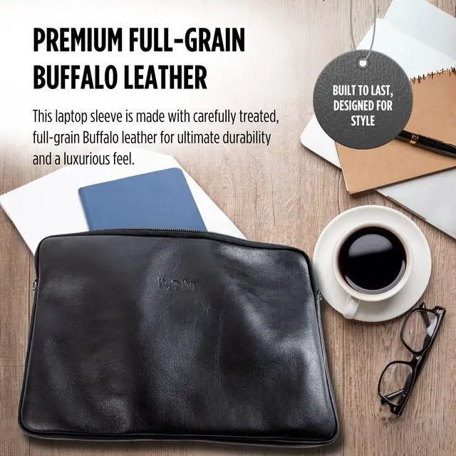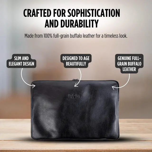 Premium Full-Grain Buffalo Leather Laptop Sleeve: Crafted from genuine full-grain buffalo leather, this leather laptop sleeve combines sophistication and durability. Designed to age beautifully, its the perfect leather laptop pouch for your Mac laptop ^^ 14'' Leather Laptop Sleeve with Soft Padding And