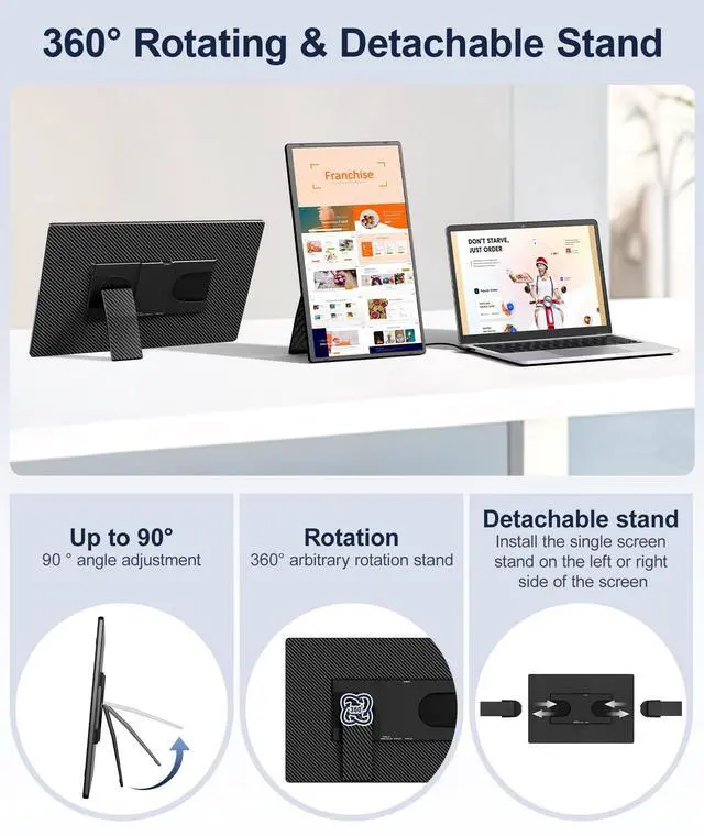 The included PU leather protective cover safeguards the screen from scratches and doubles as a convenient mouse pad, adding extra convenience for travel. Enjoy a larger screen experience anywhere, allowing you to work, study, or enjoy entertainment without the bulk of a traditional monitor. ^^ [Detachable & 360 Rotating Stand] This travel monitor is designed for maximum flexibility, featuring a detachable stand with 360 rotation that allows effortless switching between landscape and portrait modes. Screen extender perfect for a variety of tasksreview contracts vertically, compare spreadsheets side by side, or enjoy videos at the ideal angle.