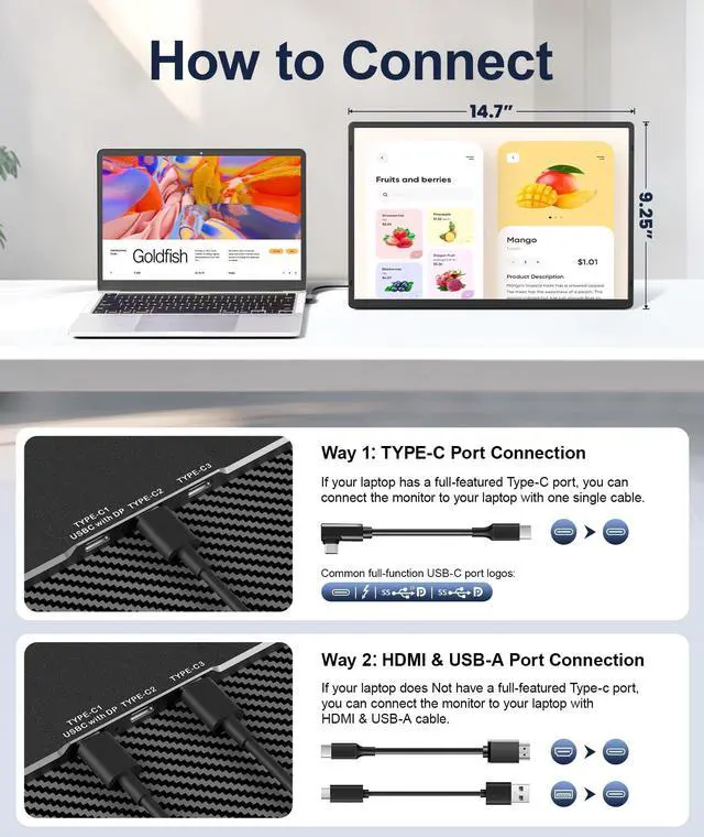 This laptop monitor extender can help boost your productivity by up to 200%, enabling you to accomplish more in less time. ^^ [Plug and Play, No Driver Required] Please make sure your laptop is equipped with a full-function Type-C port (Thunderbolt 3.0 / 4.0 with DisplayPort support and video output). In that case, you can simply connect via a single USB-C cable. If your laptop does not have a full-function Type-C port, please use both an HDMI cable (must be connected to the with DP port) and a USB-A cable together. If youre unsure about your laptops port type or encounter any connection issues, feel free to contact our customer service team.