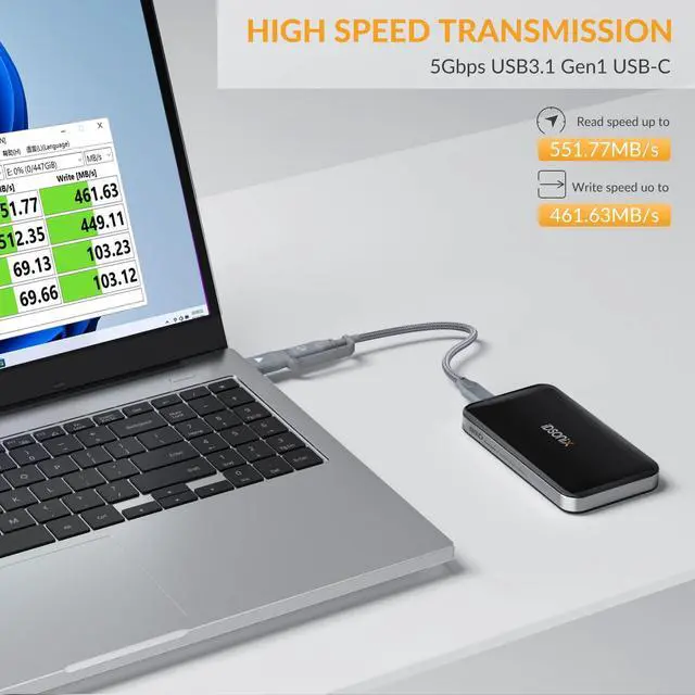 [High Speed Transmission] The 256G portable SSD delivers read speeds of up to 551MB/S, so you can quickly read data anytime, anywhere. USB 3.1 GEN1 up to 5Gbps data transfer, 10 times faster than USB 2.0, support UASP accelerated protocol. ^^ [Excellent Design] External SSD with a high gloss plastic shell + zinc alloy frame design, it can protect your data from shock and fall. Greatly extend the life of the hard disk. ^^ [Efficient heat dissipation] The portable SSD built-in heat sink vest can rapid cooling, and the data transmission is more stable, get rid the trouble of lag.