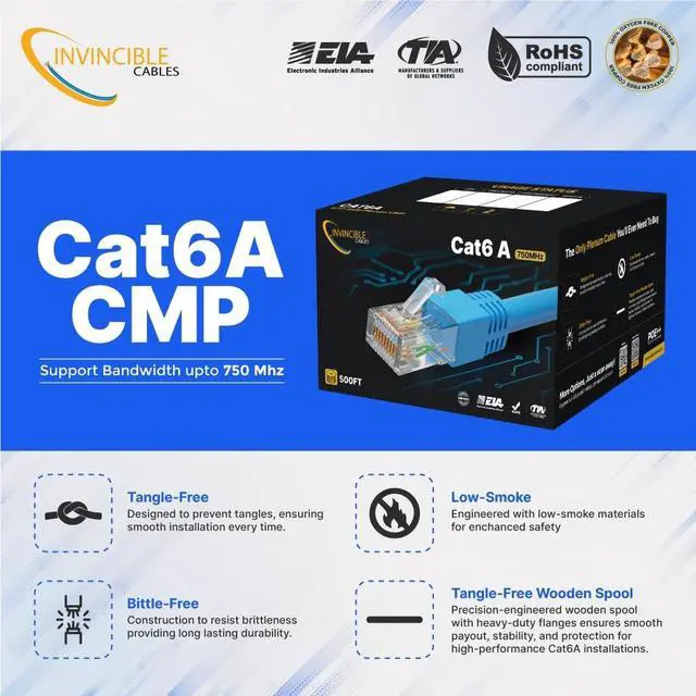^^ -: Our Cat6A plenum-rated Ethernet cable is constructed with 100% solid copper conductors for enhanced durability and conductivity. It ensures adherence to ANSI/TIA 568.2 -D standards, is RoHS-3 compliant, and is backed by a FOREVER WARRANTY, providing you with peace of mind and a solid investment in your networking infrastructure. ^^ - - -,: Simplify your installation process with our Cat6A plenum-rated Ethernet cable, packaged in a tangle-free, easy pull box. Featuring easily identifiable color-striped 4-pair UTP (Unshielded Twisted Pair) solid copper conductors and sequential footage markings, this cable ensures precise usage tracking and smooth, flexible installation in any setting.