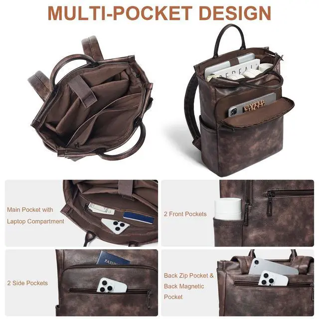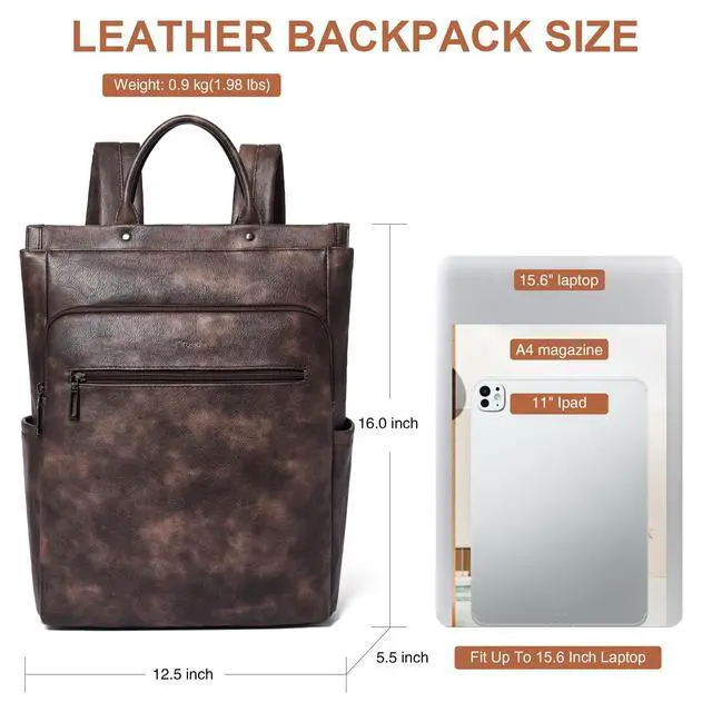 Multi-Pocket Laptop Backpack For Women: Women laptop backpack measures 16* 12.5 * 5.5 inches and weighs 1.98 lbs. This leather laptop backpack has 11 pockets, makes it easy to keep your laptop, iPads of all sizes, wallet, Phone, keys, headphones, documents (A4), and daily essentials organized. The large main pocket with a padded 15.6 inch laptop compartment (fits laptops up to 15.6" ), preventing them from sliding and bumping. ^^ High Quality Work Backpack for