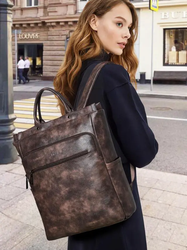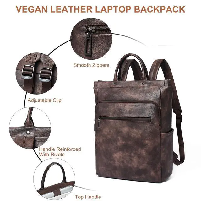 Women: Mroede leather laptop backpack made from high quality vegan pu leather and smooth zipper, and each seam is reinforced for durability. This leather backpack purse only can water-resistant against light rain and splashes.