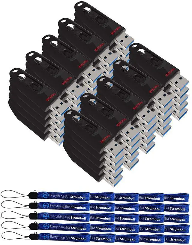 The SanDisk Ultra USB 3.0 Flash Drive moves your files 10x faster than a 2.0 Flash drive. Spend less time waiting to transfer files and enjoy high-speed USB 3.0 performance of up to 100MB/s. Its durable casing is tough enough to handle knocks with style. Whether you call it a jump drive, pen drive, memory stick, flash memory, USB, or pendrive, you can rest assured your private files stay private with password protection. High performance, high speed, and faster and more reliable than the competition! Bundle includes (50) 16GB SanDisk Ultra USB 3.0 Flash Drives and (25) Everything But Stromboli (TM) Lanyards.