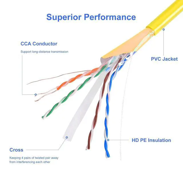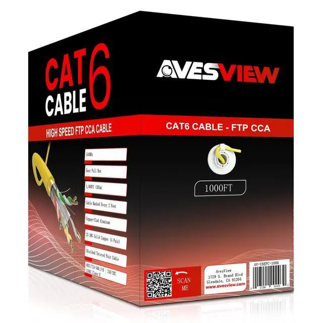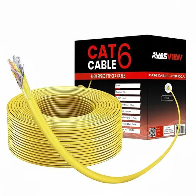 Its bright yellow jacket enhances visibility, while the shielding ensures stable, interference-resistant performance. ^^ This 1000ft Yellow FTP Shielded Cat6 cable comes in a convenient Easy Pull Box, ensuring smooth, tangle-free dispensing during installation. No snags, no hasslejust fast, efficient cable runs every time. ^^ AvesViews 1000ft Yellow FTP Cat6 Cable is engineered with 23-gauge CCA conductors, delivering strong, efficient, and reliable data transmission for high-performance network applications. The added shielding enhances stability by minimizing interference and ensuring cleaner signal quality.