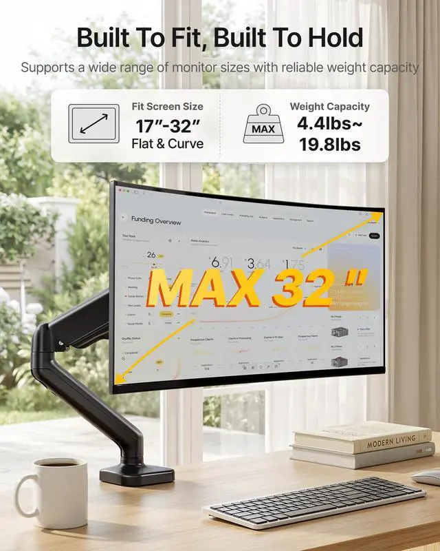 Sturdy Construction & Stable Hold: Made from robust alloy and a precision mechanical spring, this single monitor arm offers worry-free support for displays up to 32 inches and 19.8 lbs. Whether your screen is flat or curved and compatible with the universal VESA 75x75mm / 100x100mm standard, it ensures a truly stable workstation. Your monitor arm will remain firmly at the angle you set it, without any unwanted movement or tilt over time. ^^ Effortless Positioning with