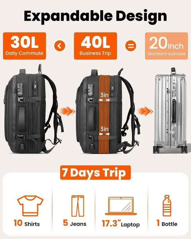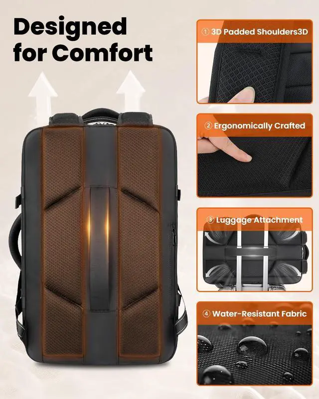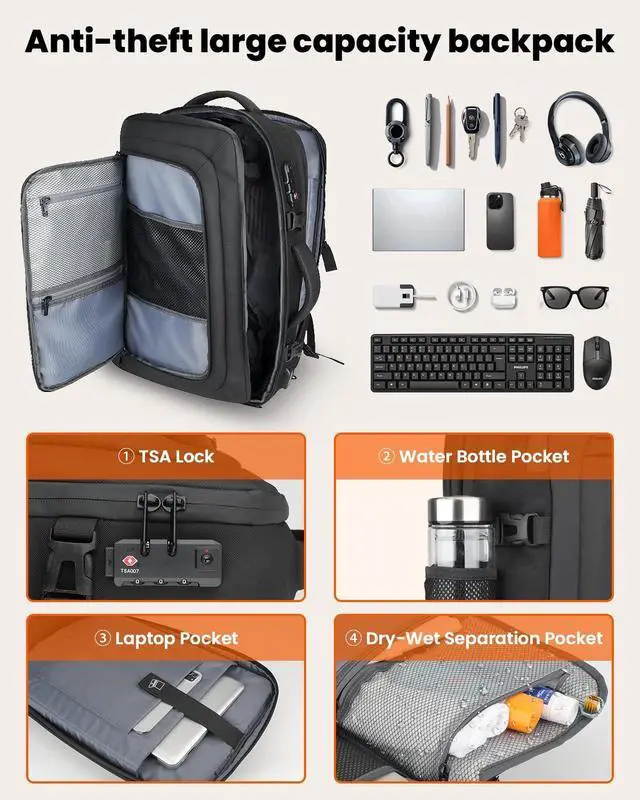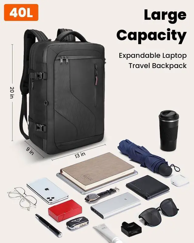 ^^ Large Capacity Design With dimensions of 18x14x8 inches travel backpack, this backpack for men women can hold up to 45 liters, making it spacious enough for all your essentials. This women mens laptop backpack features a dedicated compartment for a 17-inch laptop, a wet/dry separation pocket, and a hidden water bottle holder, making it the perfect choice for a women mens laptop backpack or a women mens work backpack. ^^ High-Quality Material Made from high-density materials, this travel backpack not only feels great to the touch but is also water-resistant and easy to clean, ensuring durability and long-lasting use in any environment.