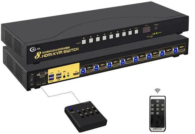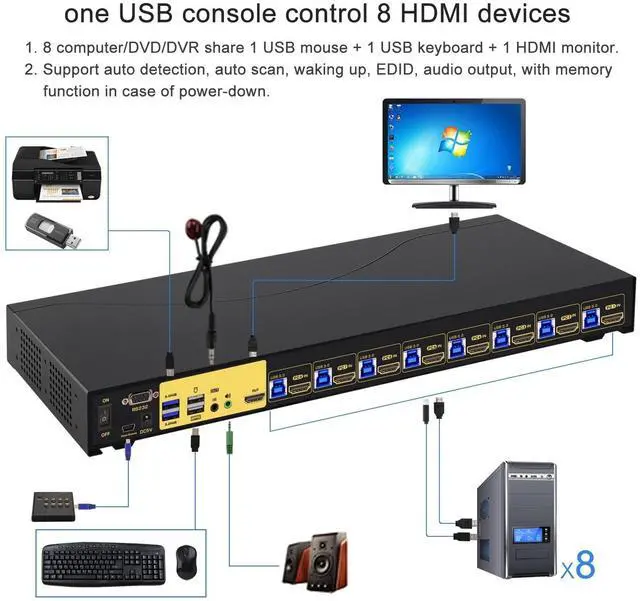 HDMI Monitor Switch: 8 computers/laptops/DVRs/NVRs sharing one set of keyboard & mouse, audio, 1 monitor and 2 pcs USB 3.0 peripheral devices. With all input cables and rank mount hook. ^^