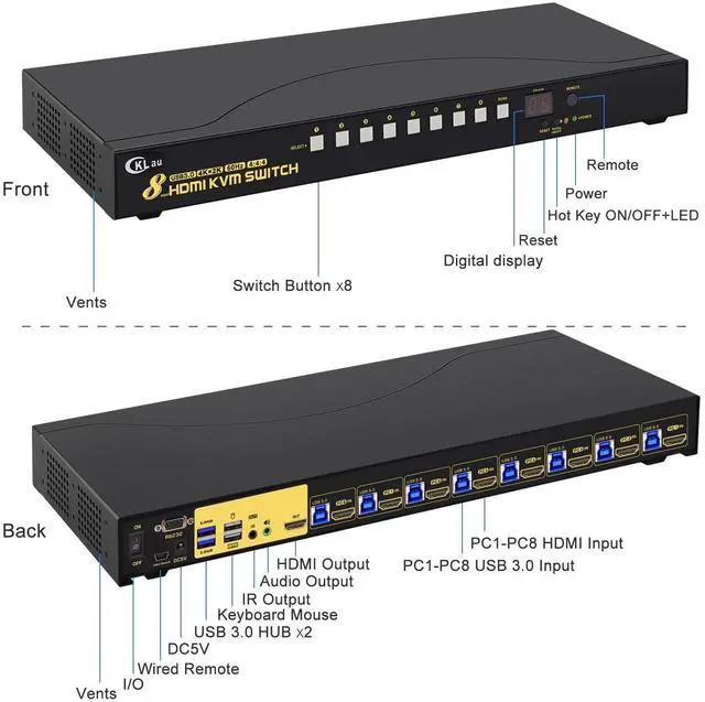 Computer Monitor Switch: Compatible 4096x2160@60Hz, 3840x2160@60Hz, 3840x1620@60Hz, 3440x1440@60/Hz, 3840x1080@60/120Hz, 3200x1800@60Hz, 2560x1440@60/144/165Hz, 2048x1536@60Hz, 2048x1280@60Hz, 2048x1080@60Hz, 1920x1200@60Hz, 1920x1080@60Hz, etc. With a DC5V 2A power adapter, power supply more stability. ^^ 5. HDMI KVM Switch 8
