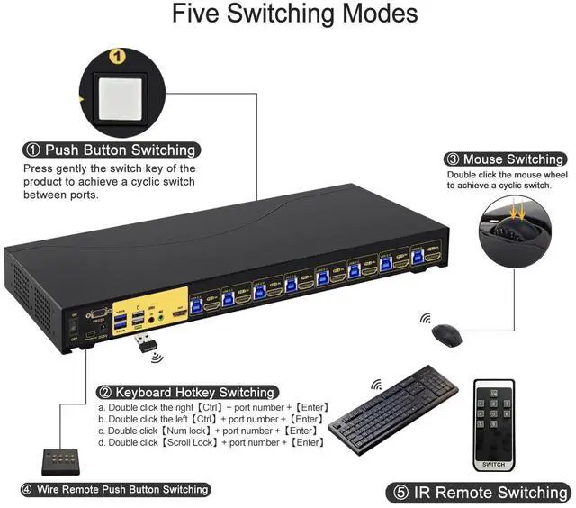 five switching way: keyboard hotkey switching(Num Lock + Num Lock + 1 / 2 / 3... + Enter, or Ctrl + Ctrl + 1 / 2 /3... + Enter, or Scroll Lock+ Scroll Lock+1 / 2 / 3... + Enter), mouse switching (click mouse wheel 2 times + left button/right button), manual button switching, IR remote switching, and wired remote push button switching. ^^
