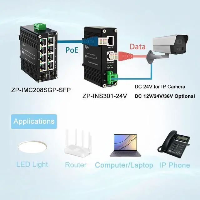 ^^ Din-Rail & Wall Mount- Industrial-grade aluminum alloy PoE injector supports 10/100/1000 Base-T Gigabit network with dual installation options. High bandwidth enables 4K/8K camera transmission, ideal for wireless APs, CCTV security, IP phones, etc.