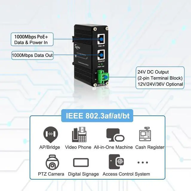 Port Configuration - Equipped with 1 x RJ45 10/100/1000Base-T PoE (Power + Data) Input Port + 1 x RJ45 10/100/1000Base-T (Data) Out Port, support IEEE 802.3 af/at Power over Ethernet (PoE+) Power Sourcing Equipment. ^^ PoE Splitter 24V- 12V/24V/36V optional. PoE Splitter splits the PoE signal into 24V DC Power Supply and Gigabit Ethernet in RJ45 so that non-PoE devices can be powered over Ethernet. ^^ Plug and Play- Require no configuration, a simple solution to expand your network to where you wish to place network devices but has no power outlet. ^^ Multiple Protection- Support 1500V high voltage isolation circuit protection, which can effectively protect electrical equipment; support short circuit protection, overvoltage protection, and work stably.
