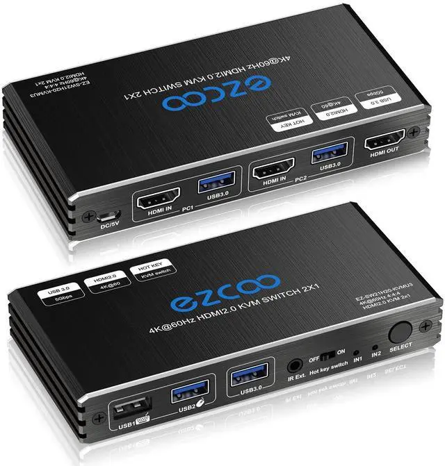 4K HDMI IN/ OUT KVM Switch 2x1 Hotkey -- USB 3.0 2-ports and HDMI 2.0 control 2 computers with one set of mouse, keyboard and 1 monitor. USB 2.0 2-ports, USB 3.0 in front side for USB peripheral devices. 4K HDR Vision Atmos HDMI 2 in 1 out KVM switcher for PS5 1080p 120Hz, Xbox series, PS4, Fire TV, Windows, MacOS, Android, Linux.