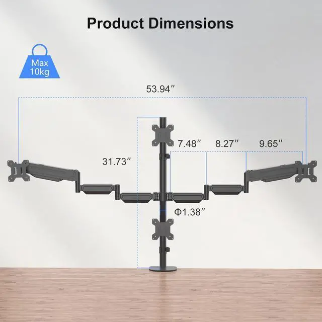 ^^ Adjustable Height: This monitor stand can adjust the height and position of the bracket arm. The arm can be adjusted forward/backward, and the VESA plate accessories connected to each screen can 80 tilt, 90 swing, and 360 rotation, so that you can view the four monitors vertically and horizontally.