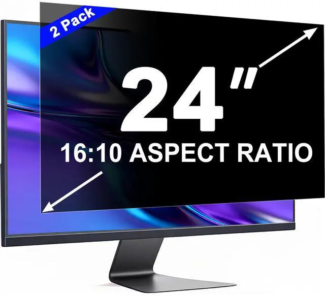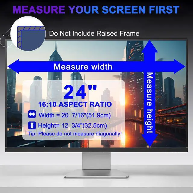 PRIVACY FILTER DIMENSIONS Width: 20 7/16" (519 mm), Height: 12 3/4" (325 mm), Diagonal: 24" ( 609.6 mm) - Aspect Ratio 16:10. Mamol computer privacy filters are designed to be perfectly compatible with HP, Samsung, Dell, Lenovo, Acer, Asus, LG, ViewSonic and other brands of monitors. Please check the width and height dimensions of your computer screen before ordering. If you have any questions about the dimensions, please contact us. ^^ [Eye Protection for You] This computer monitor privacy filter significantly eases eye strain and minimizes potential harm to your eyesight. It filters 98% of UV rays and blocks 96% of blue light. As a reversible 24-inch privacy screen filter: the glossy side of the protector delivers extra clarity and enhanced privacy, while the matte side minimizes glare and distracting reflections. It also adds an AR ultra-HD light-transmitting layer. This layer maintains the screens HD clarity without sacrificing much screen brightness, meeting your various daily needs as required. ^^