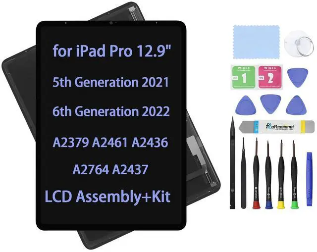 Compatible Mode: For iPad Pro 12.9" 2021 2022 5th 6th Gen generation A2379 A2461 A2436 A2764 A2437 Display LCD Screen Replacement Assembly and Glass Touch Digitizer Premium Repair KitCompatible Mode: For MNXR3LL/A MNXU3LL/A MP603LL/A MNXP3LL/A MNXQ3LL/A MNY03LL/A Display LCD Screen Replacement Assembly and Glass Touch Digitizer Premium Repair KitCompatible Mode: For MHNH3LLA MHNH3LL/A MHNM3LL/A MHNR3LL/A, MHNR3LLA MHNF3LLA, MHNF3LL/A MHNK3LL/A Display LCD Screen Replacement Assembly and Glass Touch Digitizer Premium Repair KitWHAT'S IN THE BOX? LCD Assembly Screen Replacement Premium Kit includes: (1) Brand new, factory tested full LCD Display screen with Glass Touch Digitizer Assembly Premium Tool Kit (1) Premium Screwdriver (1) Easy Opening Tool (Best tool ^^ Open device without damage ^^ Used by Pros) (1) Nylon Spudger (Safest ^^ Durable Pry Tool ^^ Not Cheap Plastic) (1) Fine Tip Curved Tweezers (High quality tool ^^ Prevent damage to flex cables during installation) (1) Cleaning Cloth (1) Adhesive Removal Pad/Alcohol Swab Pad (4) Pry Picks ^^ Warning ^^ Do Not Use Sharp Objects to