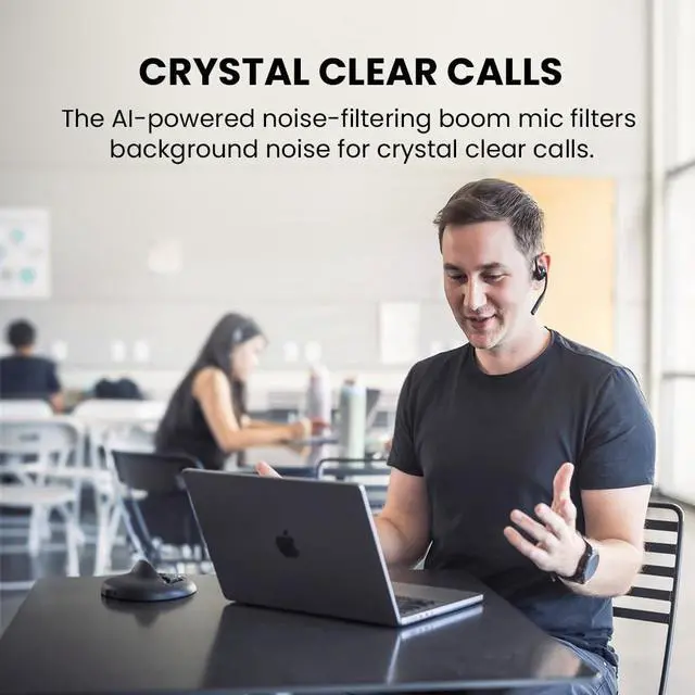 Clear Calls with Noise-Cancelling MicBuilt-in noise-cancelling mic reduces background noise, delivering clear voice quality for Bluetooth headset calls on PC, computer, and office platforms like Zoom or Teams. ^^ Open-Ear Design for All-Day ComfortOpen-ear hook design keeps ears free from pressure or blockage, offering lasting comfort without ear fatigue - ideal for long meetings and office work. ^^ Desk Charging Dock with Phone StandWireless headset charging dock keeps your headset powered and neatly stored. Built-in phone stand supports video calls and desk organization (phone stand does NOT charge phones). ^^ Up to 15 Hours per ChargeEnjoy up to 15 hours of use on a single charge, easily covering a full workday of calls and meetings without frequent recharging.