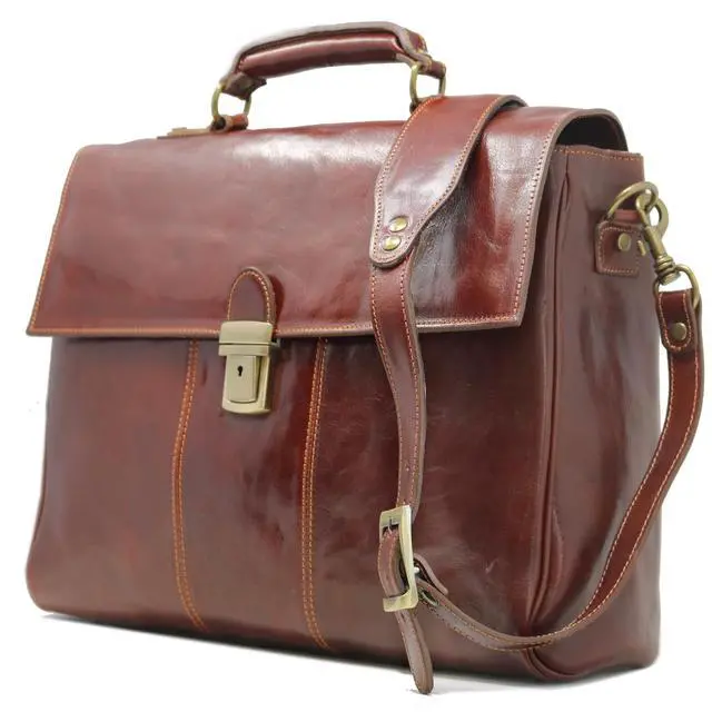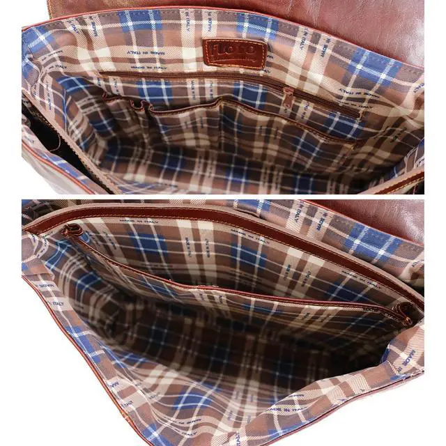 DescriptionThe Floto Venezia Laptop Briefcase is made with full grain leather and finished in brass hardware. The calfskin leather for this briefcase was vegetable tanned in Tuscany to create rich color tones while the semi gloss finish helps prevent stains. Over time this leather bag will soften and develop a beautiful patina. This laptop bag is feature rich - the inside has a 1" x 14" x 10" padded laptop sleeve pocket, 2 separate 2.5" wide gusset compartments, a large zip pocket, 2 smartphone pockets, and 2 pen holders. The back has an additional 15" x 9" zip pocket and rolling luggage strap.