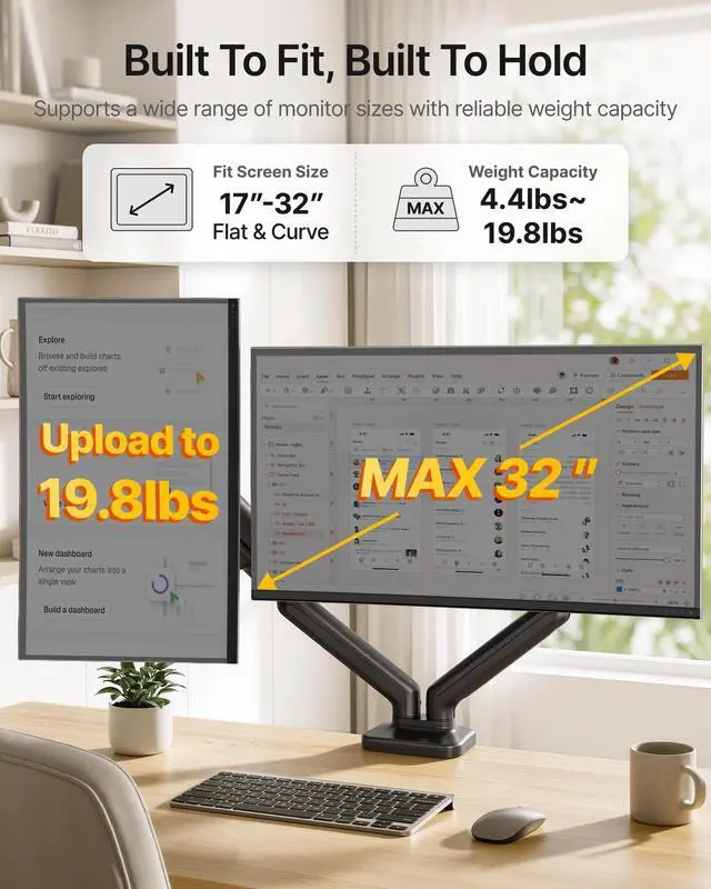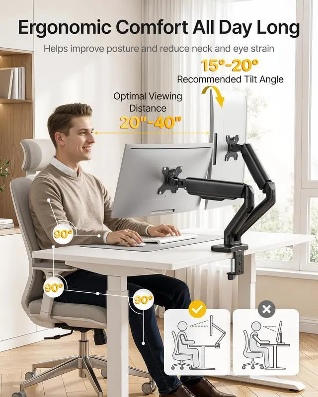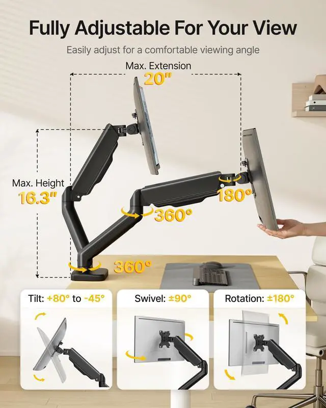 Full Motion: With a complete range of adjustment including tilt from -45 to +85, swivel up to 90, 180 rotation, and 20 height extension, this dual monitor arm lets you smoothly set your perfect view. Easily tailor the screens position to support your posture, whether raising it to reduce neck strain or angling it for comfortable reading, then lock it in for a stable, personalized perspective. ^^ Minimalist Monitor Arm, Maximum