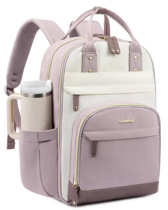 LOVEVOOK Laptop Backpack Women with Giant Tumbler Holder Pocket,17.3 inch School College Book Bag Nurse Teacher Backpack,Work Travel Backpack Laptop Computer Bag,Light purple-Off-white-Pinkish purple