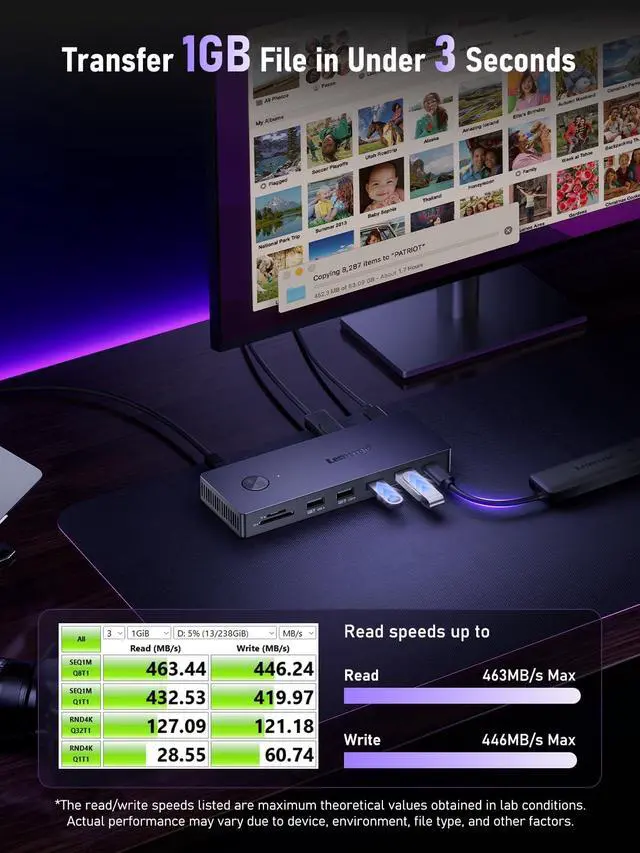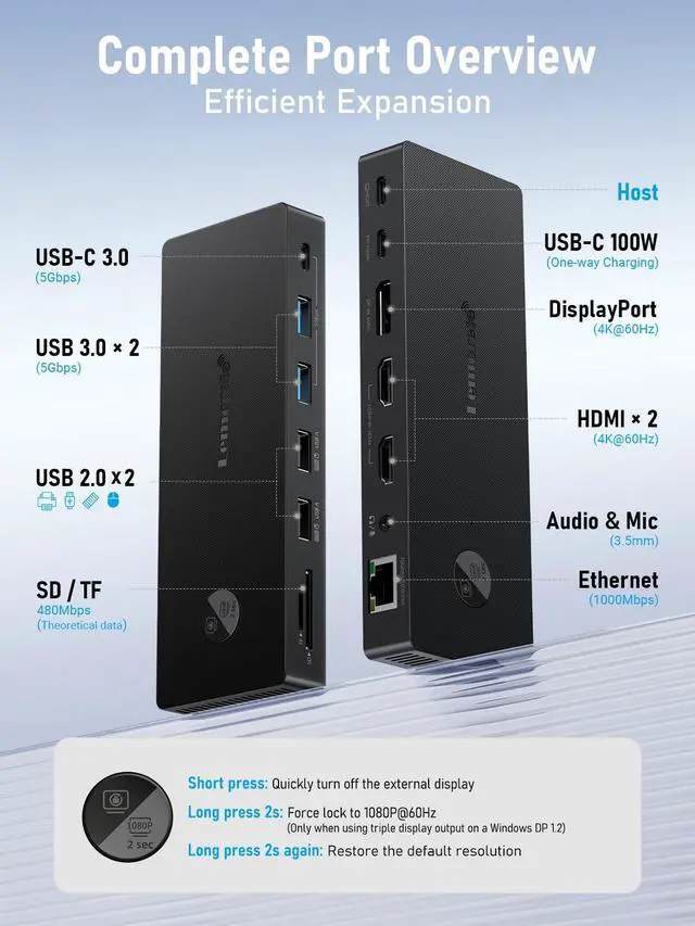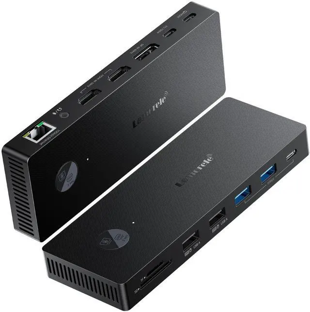 Note: Mac systems only support mirroring (SST), not extended desktop, and performance on Windows depends on your laptop and GPU. ^^ Total Connectivity for a Clutter-Free & Cool-RunningTransform your workflow. This hub consolidates everythingnetworking, storage, audio, multiple displays, and powerinto a single, sleek aluminum body that dissipates heat efficiently to maintain peak performance during prolonged use. Eliminate cable chaos and build a focused, efficient, and professional workstation ^^ Fast Data Transfer & PD Charging PortUSB-C 3.0 No longer distinguish between data transmission and fast charging port, fulfill the 10Gb/s high speed rates data transfer at the same time. And this laptop docking station with power delivery support 100W PD Charging (This docking station will occupy 15W power to work, so only 85W power for laptop charging ^^ Gigabit Ethernet & Audio/Mic Docking station ethernet port download movies quickly and reduce game lag. This laptop docking station with 3.5 mm Audio/Mic