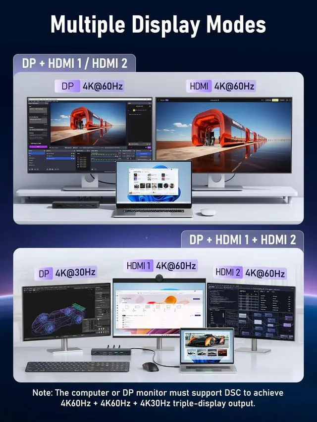 13 in 1-USB C docking sation2Hdmi, 3 USB 3.0 and 1 USB 2.0 ports, 100W PD charging, an SD/TF card reader, and a dedicated data-only USB-C port. No drivers are requiredall ports operate simultaneously at full capacity. Compact and lightweight, its designed for effortless portability and seamless productivity. (MacOS only supports SST mode and does not support MST mode) ^^ Triple Display ExpansionThis docking station lets you expand to three independent displays via MSTconnect 2x HDMI and 1x DP 1.4 to your Windows laptop. With DSC support, compatible Windows devices can drive triple 4K @ 30Hz, making it easy to spread financial charts, code, and research across all screens for pro-level multitasking.