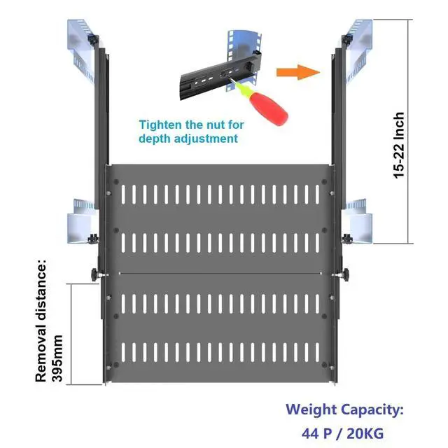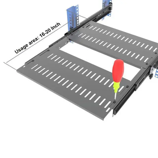 ^^ Adjustable Depth: The 4-post rack mount shelf can be adjusted between 14.6 inches and 22.3 inches to accommodate various rack depth. The tray is composed of 2 pcs of 8" deep shelves and the tray depth can be adjusted between 16 inches and 20 inches for storing various equipment sizes.